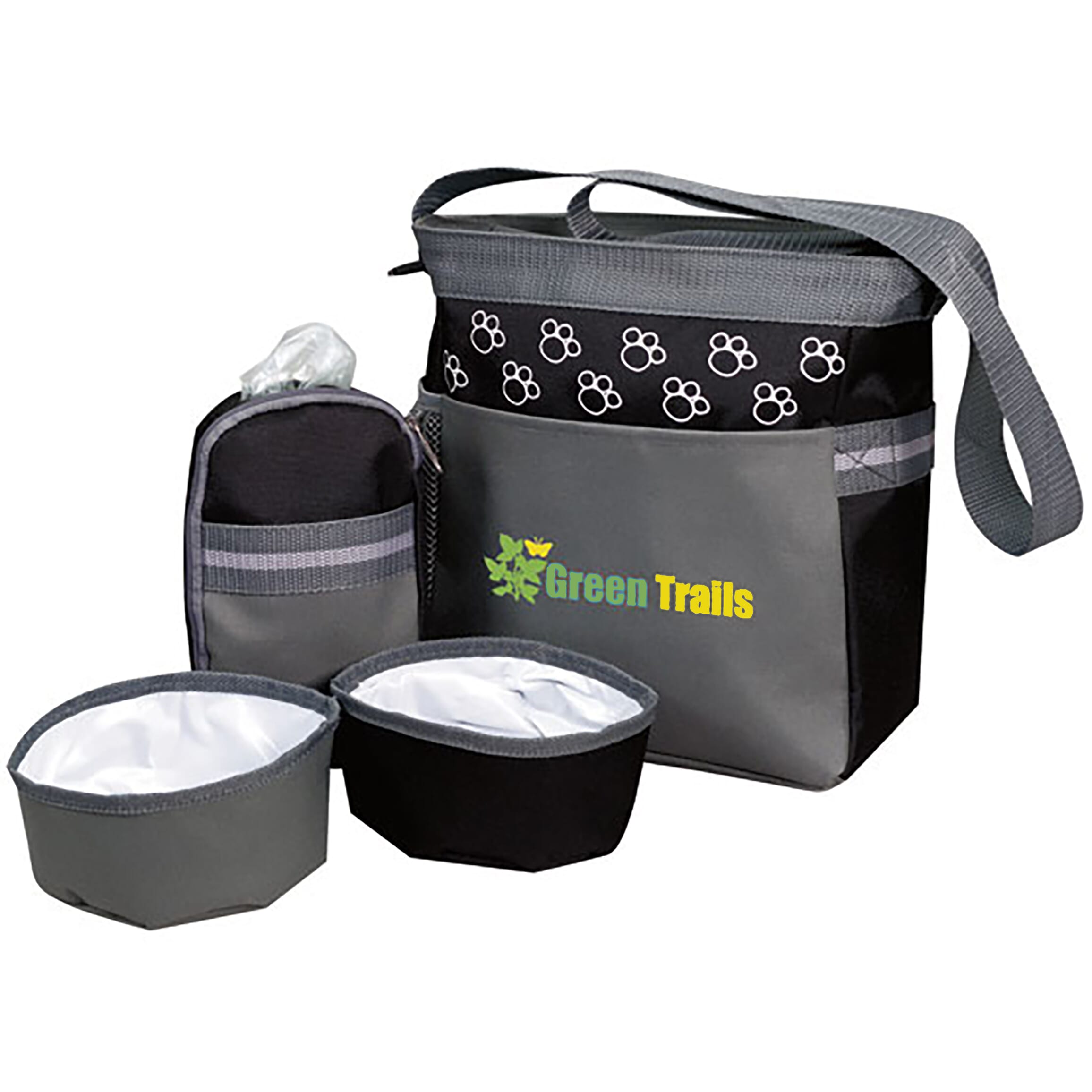 • Polyester dog supplies bags include 2 collapsible bowls, a large carrying bag and a detachable zip case for storing extra items such as treats, toys or waste bags.