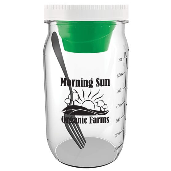 • A 27 oz. Tritan plastic mason jar styled salad container.